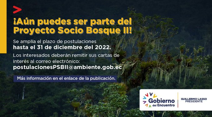 Escríbenos al correo postulacionesPSBII@ambiente.gob.ec, hasta el 31 de diciembre del 2022.